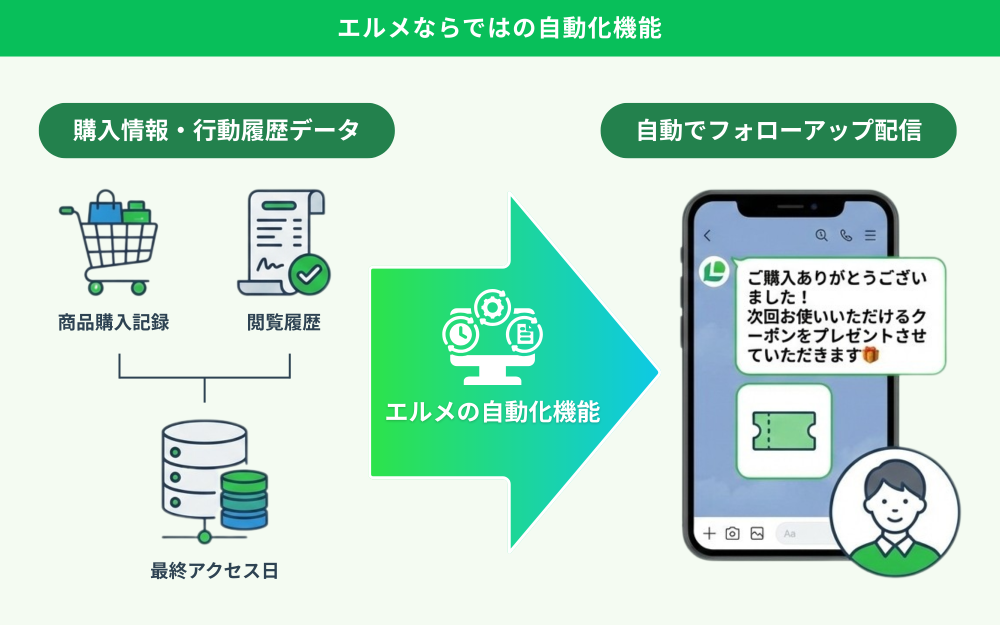 例えば、購入情報や行動履歴をもとに、フォローアップメッセージを自動で配信したり、上位プランや関連商品の案内(アップセル・クロスセル)を適切なタイミングで届けたりすることができます。