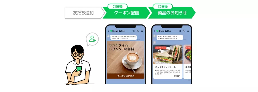 たとえば、友だち追加当日にウェルカムメッセージ、3日後におすすめ商品紹介、1週間後にクーポン配信といったシナリオを設定することで、自動的に関係性を深められます。