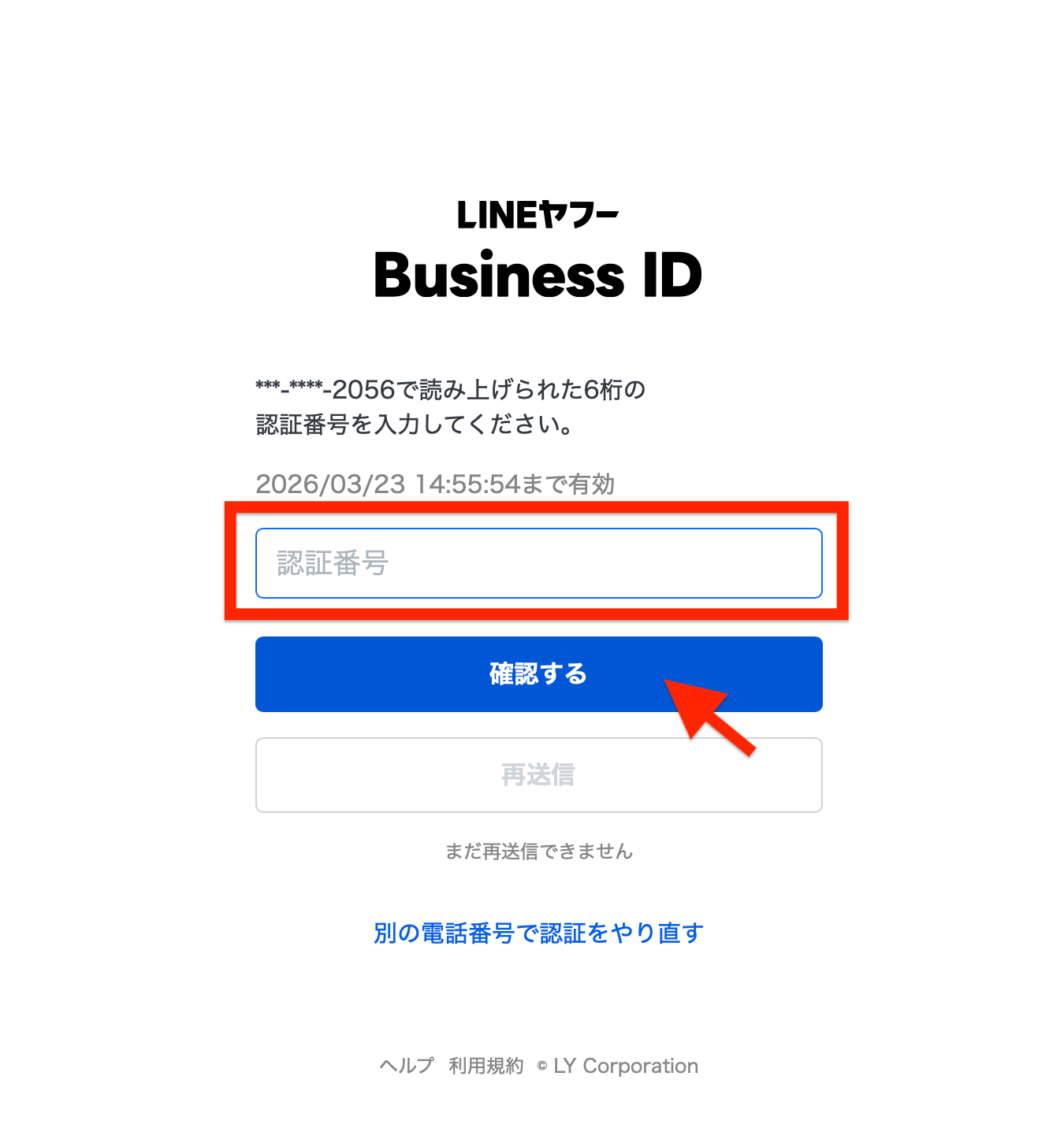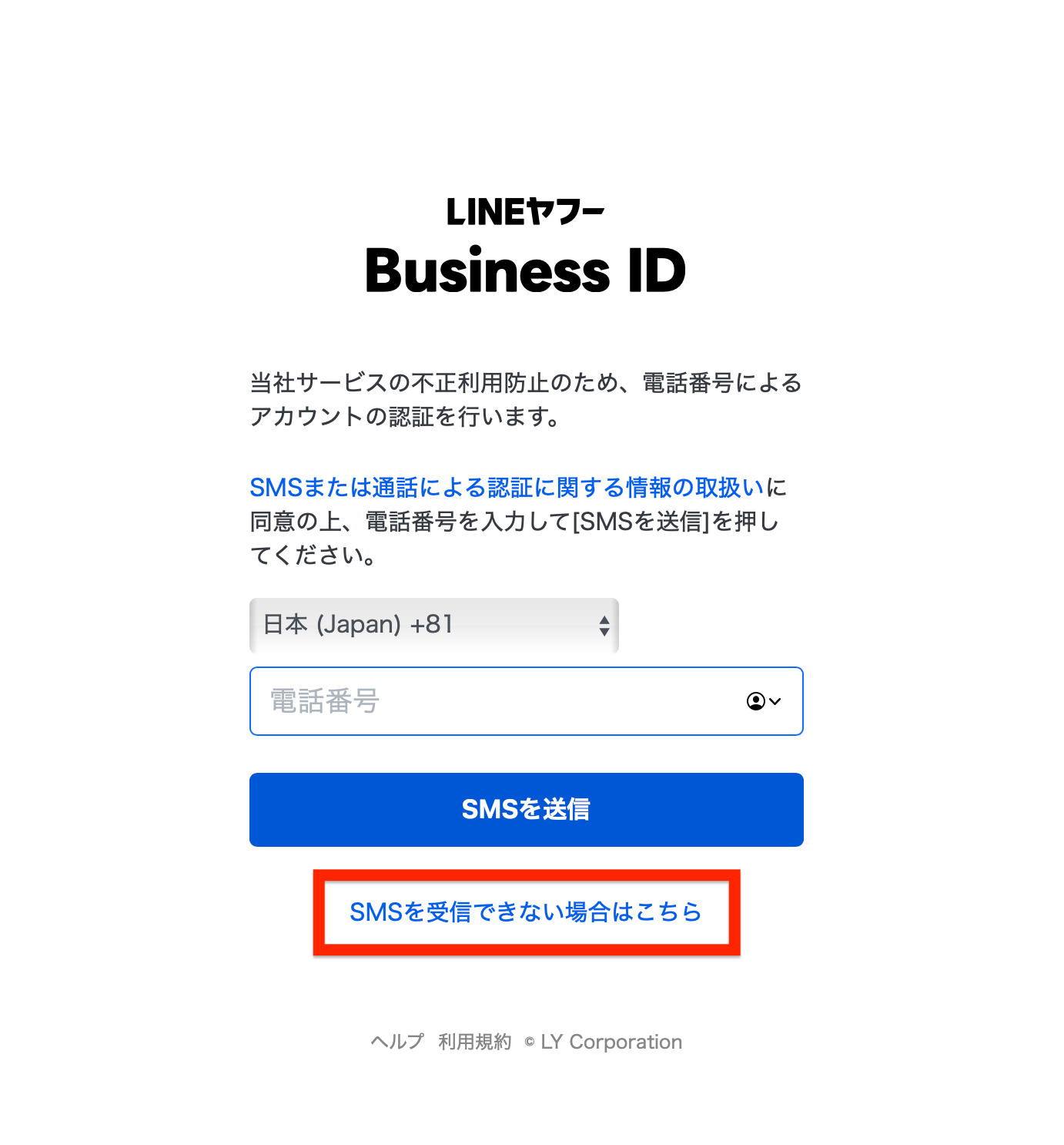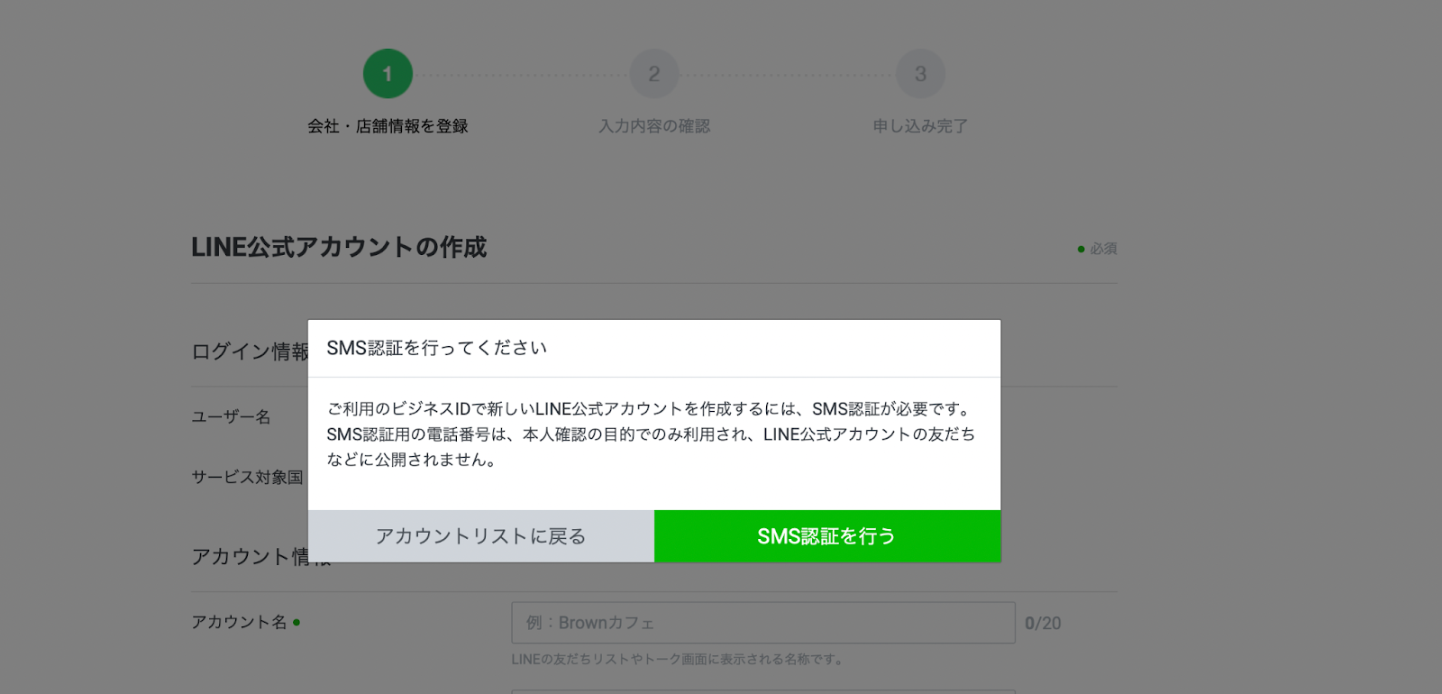 ビジネスアカウントの登録情報の入力が完了し、初めて「LINE公式アカウント」を作成する際に、SMSまたは音声通話による本人確認が求められます。