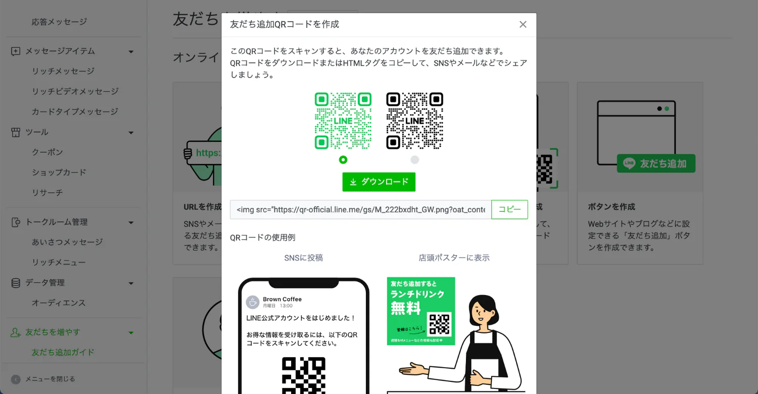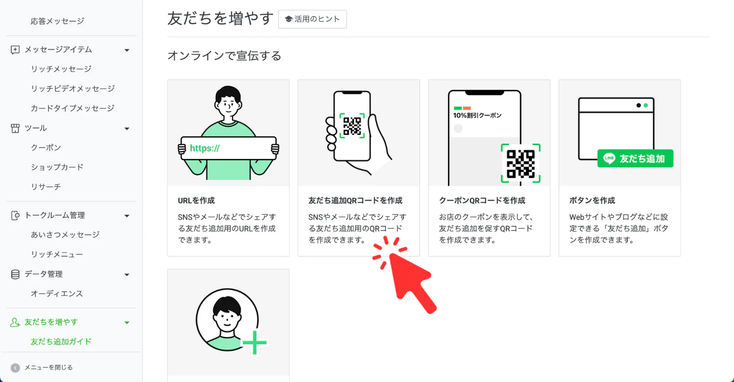 次に「オンラインで宣伝する」の「友だち追加QRコードを作成」を選択し、QRコード作成画面に進みます。