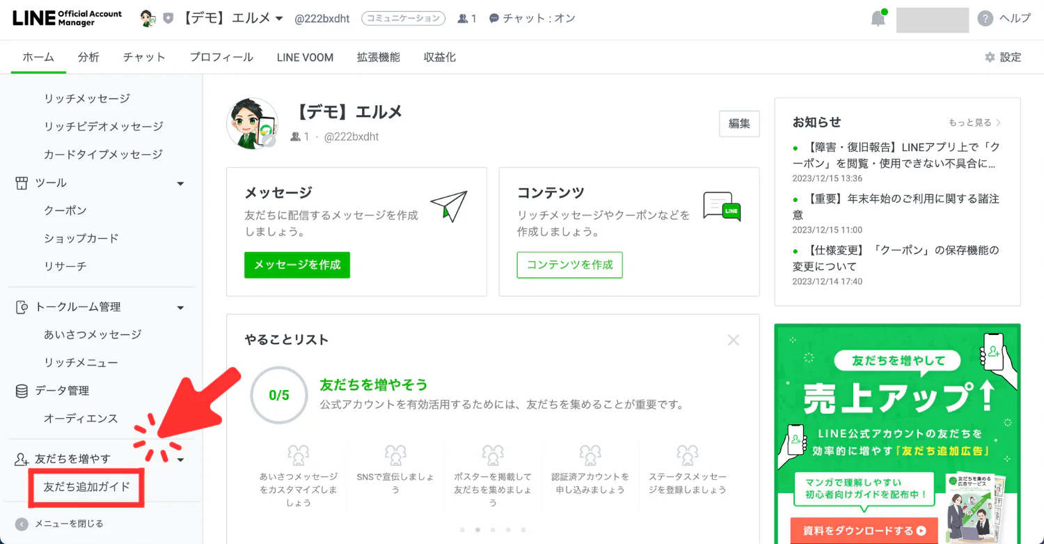まずは、LINE公式アカウントの管理画面にログインし、ホーム画面の「友だちを増やす」内の「友だち追加ガイド」をクリックします。