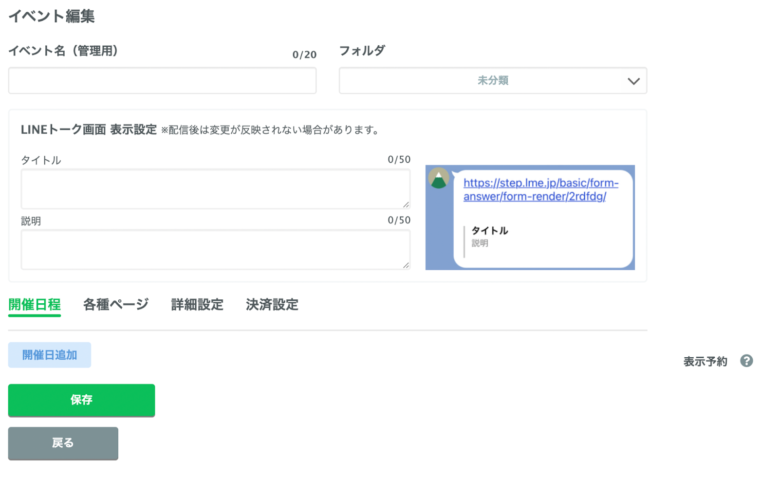 イベント名、タイトル、説明を入力し、開催日時、各種ページ等、必要に応じて設定して保存します。