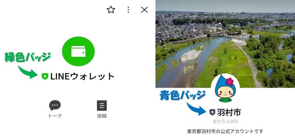 アカウント名の横に「緑色」または「紺色」の認証バッジが付いていれば、基本的に安全なアカウントであると判断できます。LINE公式アカウントの認証バッジは、LINEヤフーが審査を行った上で認定した証です。
