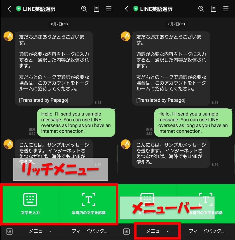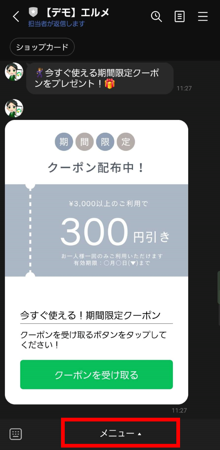 ここで注意していただきたいことは、このメニューバーは「サービスメニューバー」と異なることです。サービスメニューバーとは、トークルームの上部に表示され、クーポンやショップカードなどの対象機能へのリンクを提供する機能です。