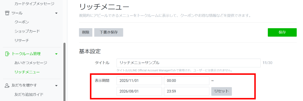 リッチメニューの基本設定の表示期間より、終了日が過去の日時になっていた場合、特に指定がなければ15年後や20年後といった長期間で設定するとよいでしょう。