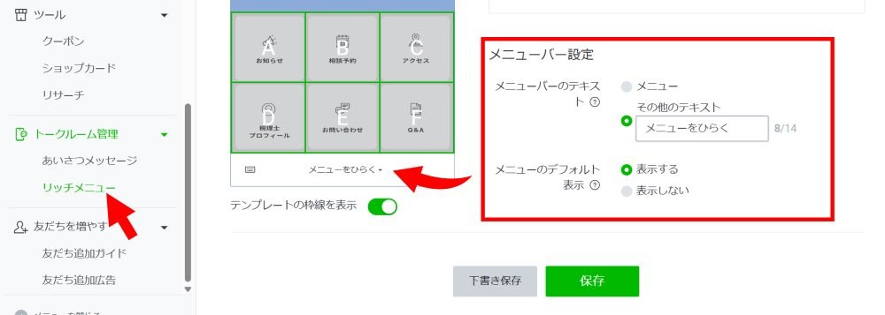 メニューバーは、リッチメニューの設定画面からテキストの変更が可能です。