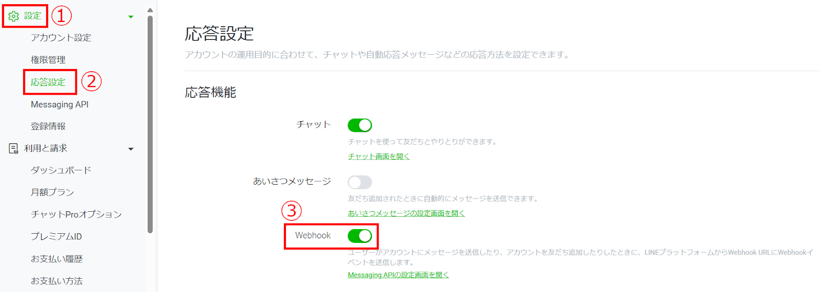 最後に、LINE公式アカウントの管理画面に戻り、「設定」→「応答設定」から「Webhook」をオンにしましょう。実際にテストメッセージを送って、正しく動いているか確認できれば設定完了です。