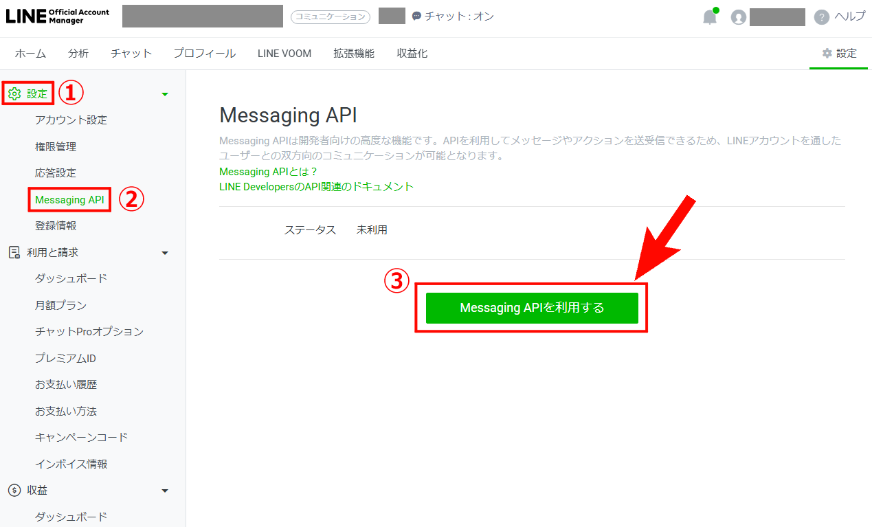 まず、LINE公式アカウントの管理画面にログインし、「設定」から「Messaging API」を開きます。「Messaging APIを利用する」というボタンをクリックすれば、自動的に連携に必要な初期設定が完了します。