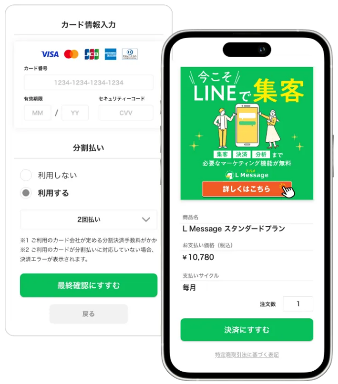 L Message(エルメ)なら、UnivaPayやStripeの決済サービスと連携し、LINE上での販売から決済までを一貫して行えます。