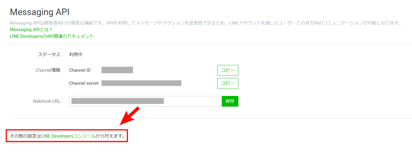 初期設定が完了すると、画面に「その他の設定はLINE Developersコンソールから行えます。」というテキストリンクが表示されます。このテキストリンクをクリックし、LINE Developersの設定画面を開きましょう。