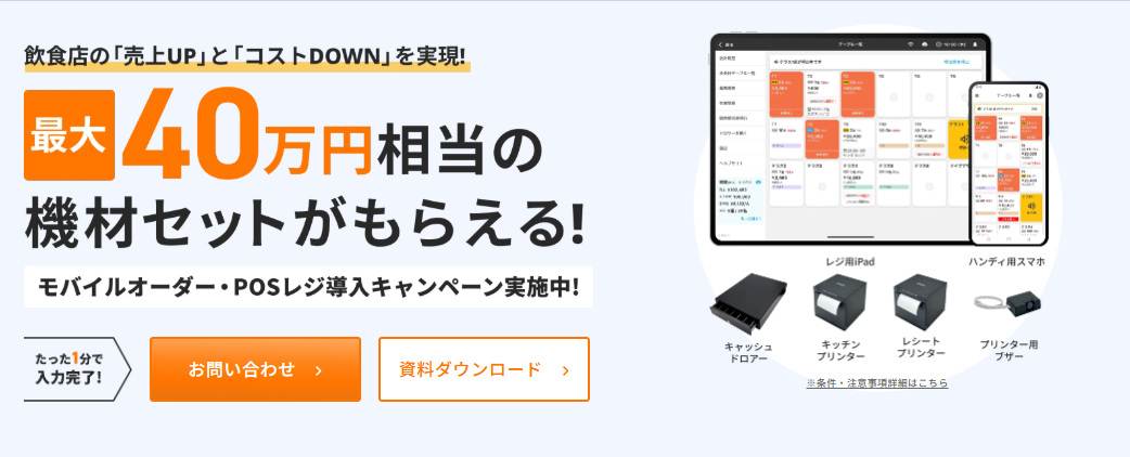 ダイ二―の初期費用にはレジ用タブレット、キッチン用プリンタ、レジ用プリンタ、キャッシュドロア、ハンディ用スマホの導入費用が含まれているため、他のパッケージに比べて高くなっています。