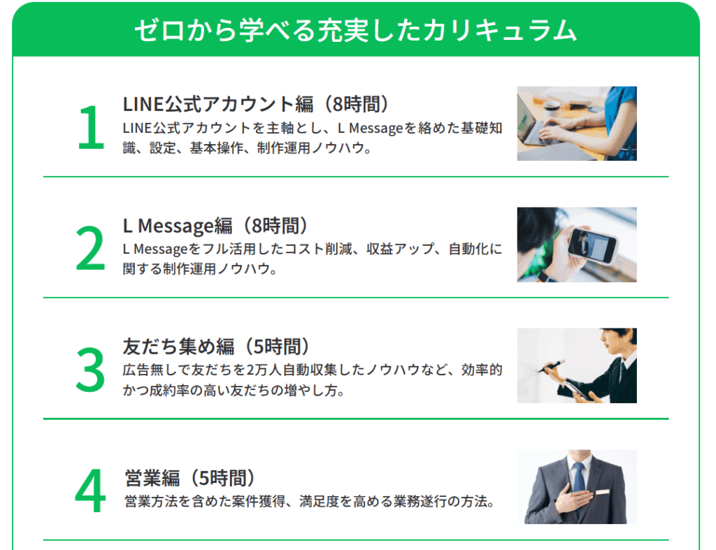 「LINE公式アカウントもL Messageも初めて」という方でもご安心ください。基礎から実務・営業ノウハウまでしっかり学べる環境をご用意しています。